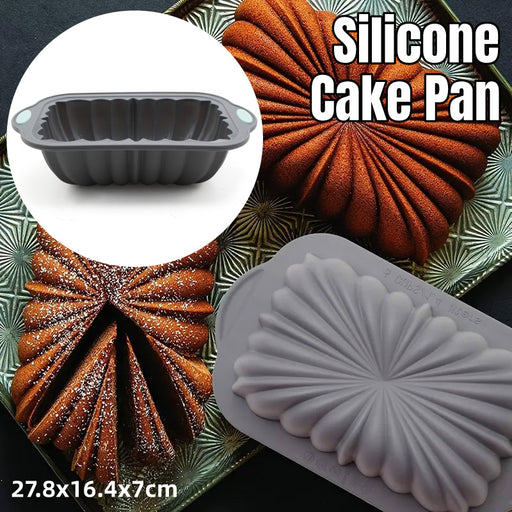 This silicone cake pan is designed for baking cakes, toast, and other treats in a rectangular flower shape. It measures 10.9 x 6.5 x 2.8 inches (27...