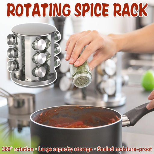 This rotating stainless steel spice rack features a 360° spinning base and 12 refillable glass jars, offering easy access and space-saving convenie...