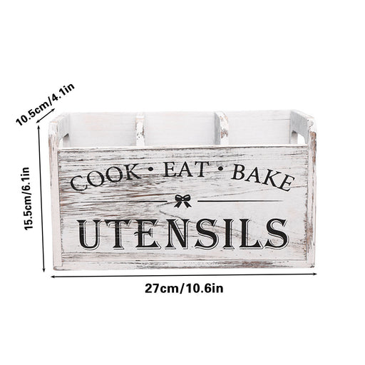 A rustic wooden organiser that keeps everyday utensils tidy and within reach, styled with a distressed farmhouse look to suit counters, dining tabl...