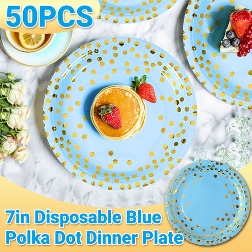 View full details50 Pcs Blue Paper Dessert Plates with Gold Polka Dots