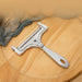 This stainless steel cheese slicer is designed for restaurant kitchens to handle cheese preparation efficiently. Its adjustable knob allows staff to achieve the preferred slice thickness while maintaining consistency during food prep.